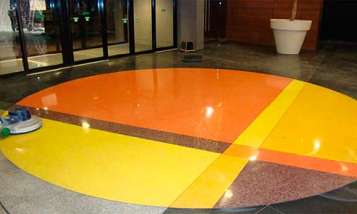 El piso Decorativo se ejecuta con Terrazo Epoxy, que es un sistema de pavimentación a base de resina que combina la apariencia altamente decorativa del mármol, con durabilidad, resistencia química y un mantenimiento fácil y de bajo costo. Este sistema ofrece posibilidades ilimitadas de color y diseño y es usado habitualmente en espacios públicos, donde la intensidad de uso es una condicionante.