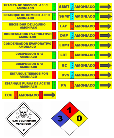 Señaléticas autoadhesivas con colores y flechas de dirección de flujo, para ser implementadas en sistemas de refrigeración industrial con amoniaco, según boletín N°114 de la IIAR y las nuevas normativas y reglamentaciones de condiciones de seguridad exigidas por el MINSAL.